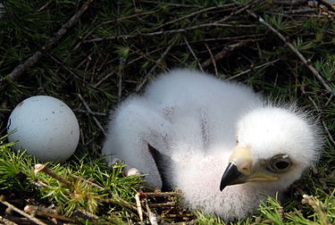 Покрытые белым с сероватым налётом пухом птенцы появляются на свет в том же порядке, что и откладывались яйца — с интервалом в несколько дней. При этом больше шансов выжить у первенца, который ведёт себя агрессивно по отношению к младшим братьям и сёстрам — клюёт их, отталкивает и не даёт принимать пищу. При этом родители остаются безучастны к происходящему. В результате 50—80 % появившихся вторыми птенцов погибают в первые же две недели жизни. [31] Пока птенцы маленькие и беспомощные, самец самостоятельно добывает корм и приносит его в гнездо, в то время как самка согревает и кормит выводок, разрывая добычу на части. Как только птенцы подрастают и начинают самостоятельно склёвывать пищу, самка также вылетает на охоту. [36] В возрасте 65—80 дней орлята встают на крыло, однако ещё долго остаются в пределах гнездового участка — например, в Шотландии и Скандинавии до октября, а в Альпах до зимы, в некоторых случаях до января. [2] Продолжительность жизни беркутов на воле в среднем составляет около 23 лет [37] , так что даже при малой репродуктивности популяция остаётся стабильной. Максимально известный возраст в дикой природе в Европе был зарегистрирован в Швеции — более 32 лет. [38] В зоопарках орлы доживают до 50 лет. [31]