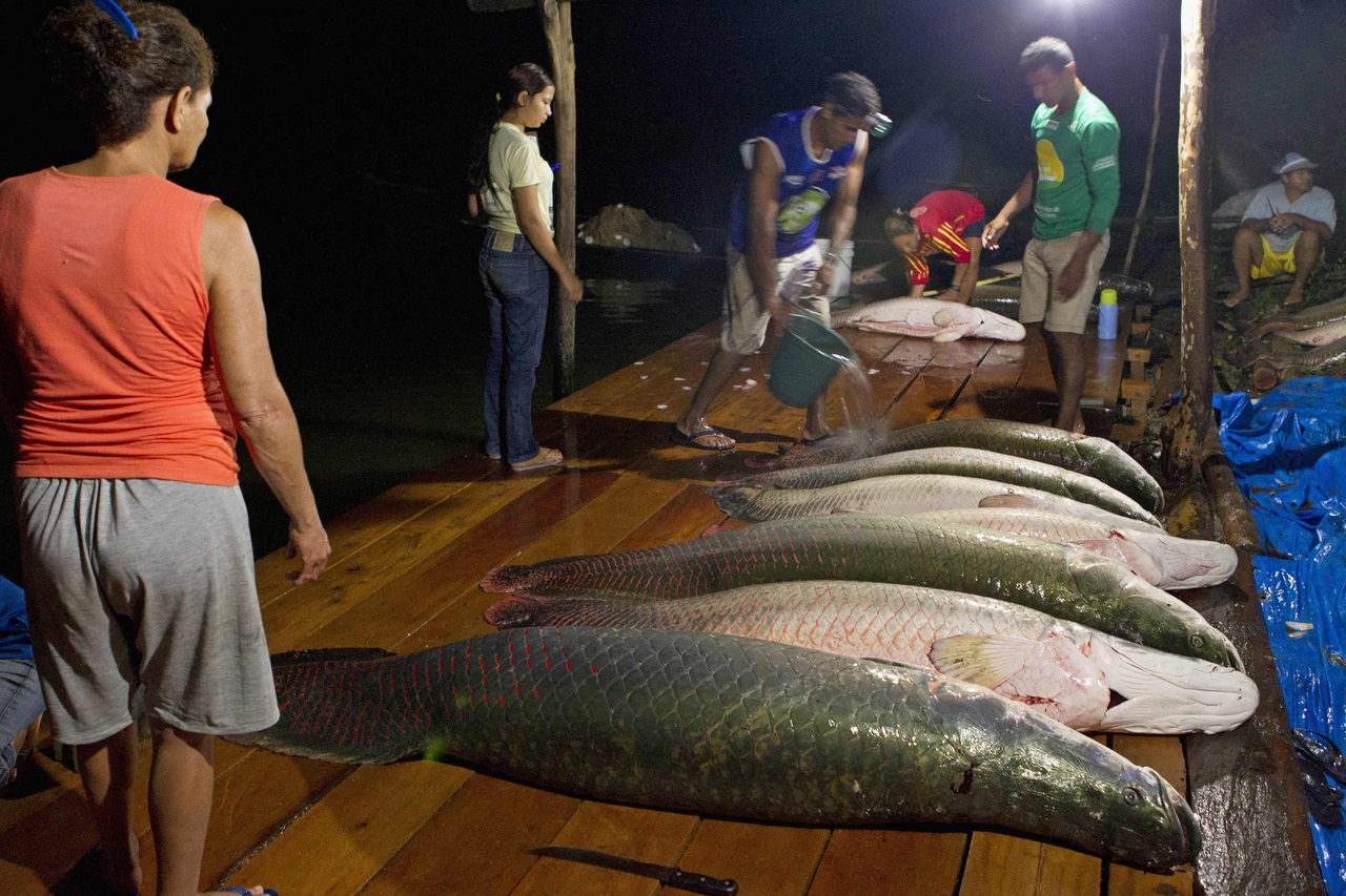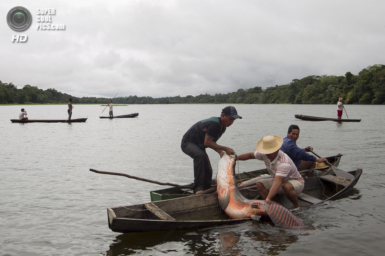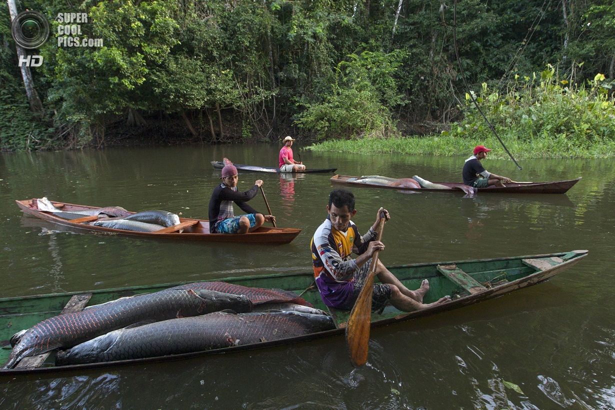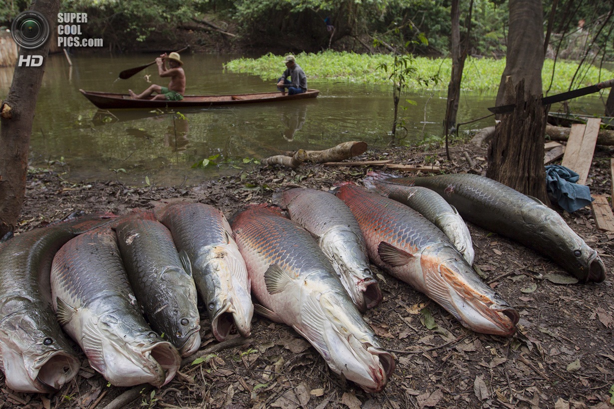 Жители деревушки Медио Журуа (Medio Jurua) демонстрируют выпотрошенную пираруку на озере Манария, муниципалитет Карауари, штат Амазонас, Бразилия, 3 сентября 2012 года. Пираруку – крупнейшая пресноводная рыба Южной Америки.