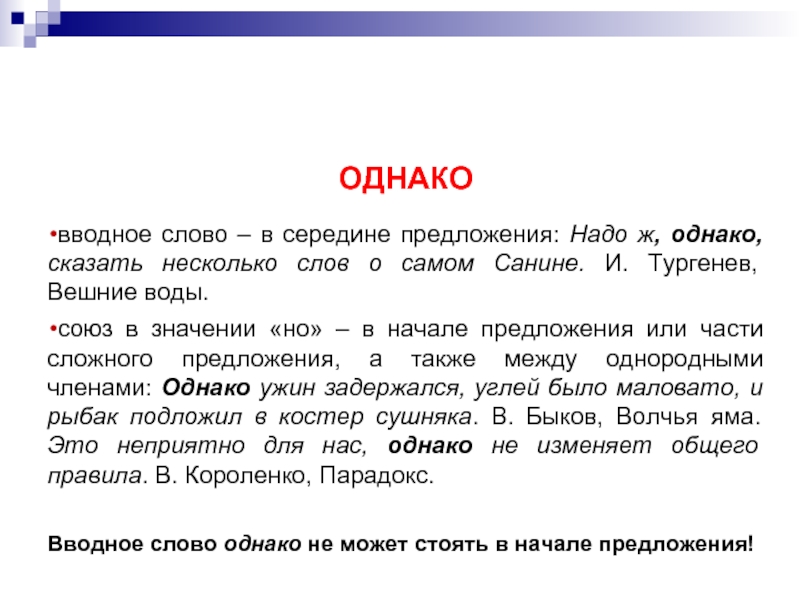 союз в значении «но» – в начале предложения или части сложного предложения, а также между однородными членами: Однако ужин задержался, углей было маловато, и рыбак подложил в костер сушняка. В. Быков, Волчья яма. Это неприятно для нас, однако не изменяет общего правила. В. Короленко, Парадокс.