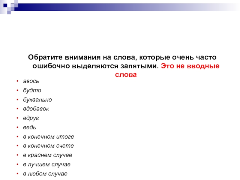 Обратите внимания на слова, которые очень часто ошибочно выделяются запятыми. Это не вводные слова