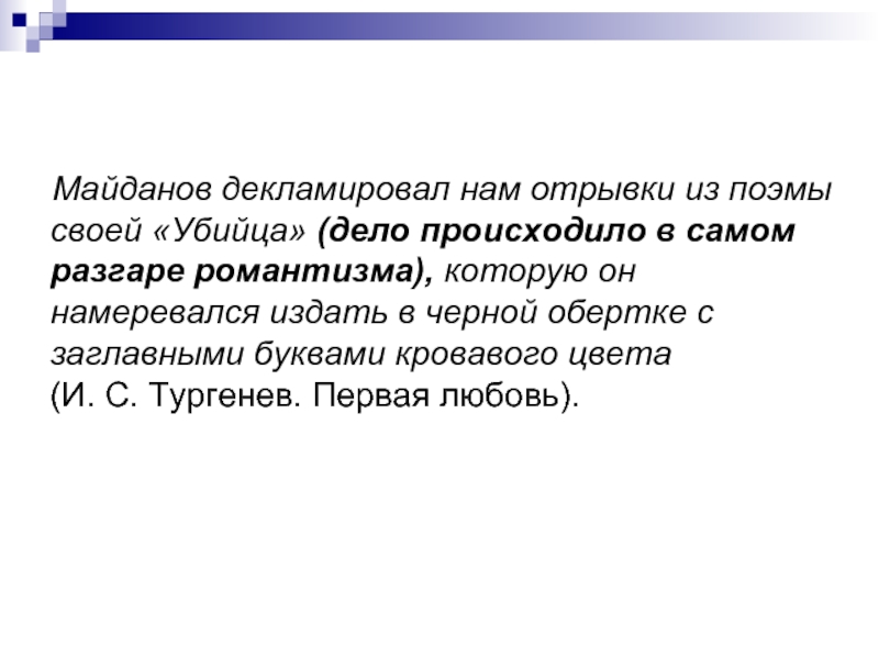 Майданов декламировал нам отрывки из поэмы своей «Убийца» (дело происходило в самом разгаре романтизма), которую он намеревался издать в черной обертке с заглавными буквами кровавого цвета (И. С. Тургенев. Первая любовь).