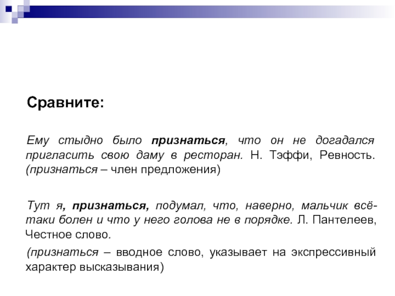 Ему стыдно было признаться, что он не догадался пригласить свою даму в ресторан. Н. Тэффи, Ревность. (признаться – член предложения)