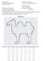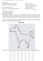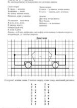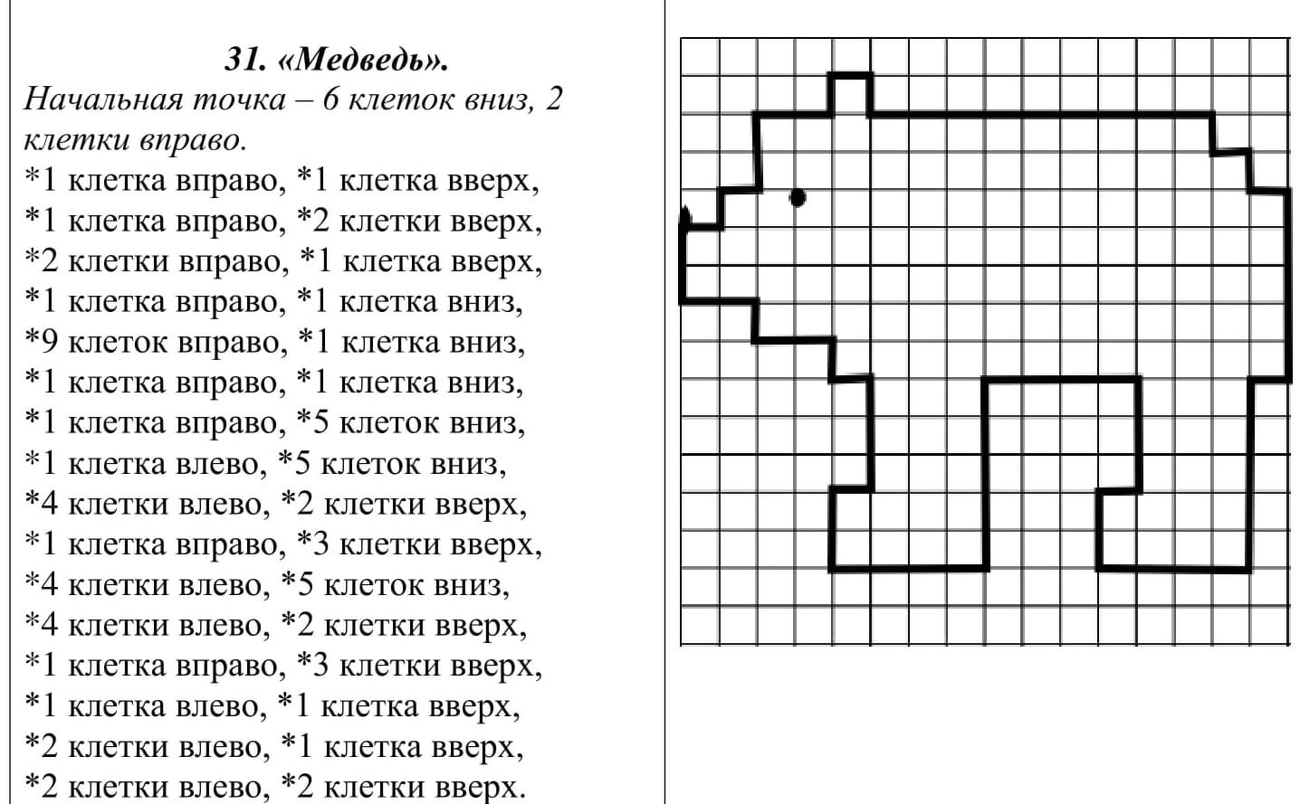 Задания средней сложности предполагают умение хорошо считать не только в первом десятке. Расширяются возможности движения под углом в указанном направлении. Такие диктанты могут быть выполнены не только одним цветом. Рисунки становятся более реалистичными.
