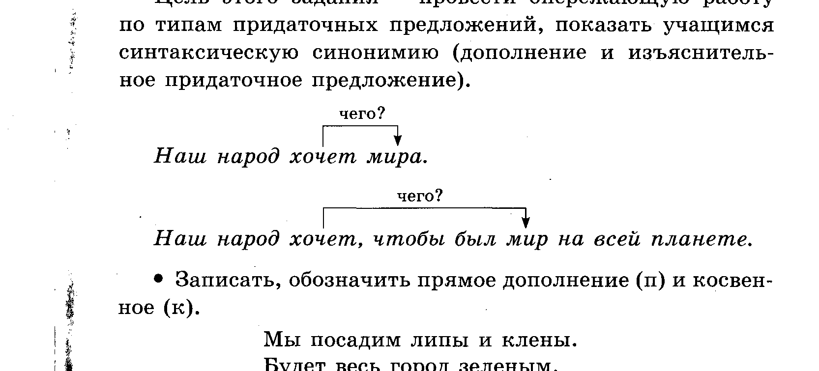 Цель этого задания — провести опережающую работу по типам придаточных предложений, показать учащимся синтаксическую синонимию (дополнение и изъяснительное придаточное предложение).