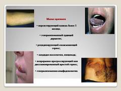 Слайд 9 Малые признаки • персистирующий кашель более 1 месяца; • генерализованный зудящий дерматит; • рецидивирующий опоясывающий герпес; • кандидоз носоглотки, пищевода; • непрерывно прогрессирующий или диссеминированный простой герпес; • генерализованнаялимфаденопатия.