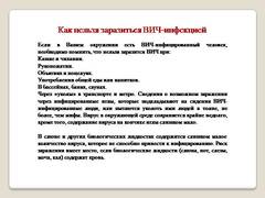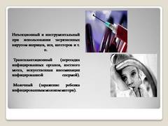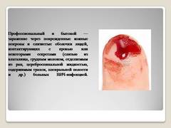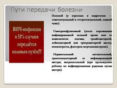 При внутривенном введении наркотиков она составляет 30%. Вероятность заражения при получении медицинской помощи с нарушением целостности кожных покровов и слизистых - 0,3%. Несмотря на то, что при однократном половом акте вероятность заражения низкая, половой путь является доминирующим. Высокие показатели обусловлены рядом факторов, способствующих повышению эффективности передачи вируса при половых контактах, а именно: наличие у человека заболеваний, передающихся половым путем; наличие хронических воспалительных заболеваний половых органов; наличие микротравм половых органов; частая смена половых партнеров; отсутствие предохранительных средств.