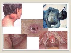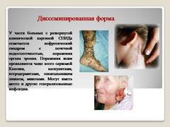 Слайд 10 У части больных с развернутой клинической картиной СПИДа отмечается нефротический синдром с почечной недостаточностью, поражения органа зрения. Поражения кожи проявляются чаще всего саркомой Капоши, васкулитами, ксеродермитами, опоясывающим лишаем, микозами. Могут иметь место и другие генерализованные инфекции. Диссеминированная форма