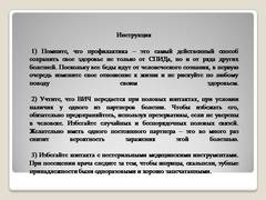 Слайд 13 Инструкция 1) Помните, что профилактика – это самый действенный способ сохранить свое здоровье не только от СПИДа, но и от ряда других болезней. Поскольку все беды идут от человеческого сознания, в первую очередь измените свое отношение к жизни и не рискуйте по любому поводу своим здоровьем. 2) Учтите, что ВИЧ передается при половых контактах, при условии наличия у одного из партнеров болезни. Чтобы избежать его, обязательно предохраняйтесь, используя презервативы, если не уверены в человеке. Избегайте случайных и беспорядочных половых связей. Желательно иметь одного постоянного партнера – это во много раз снизит вероятность заражения этой болезнью. 3) Избегайте контакта с нестерильными медицинскими инструментами. При посещении врача следите за тем, чтобы шприцы, скальпели, зубные принадлежности были одноразовыми и хорошо запечатанными.