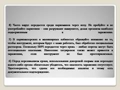 Слайд 14 4) Часто вирус передается среди наркоманов через иглу. Не пробуйте и не употребляйте наркотики – они разрушают иммунитет, делая организм наиболее подверженным к заражению. 5) В парикмахерских и маникюрных кабинетах обращайте внимание на то, чтобы инструмент, которым будут с вами работать, был обработан специальным раствором. Поскольку ВИЧ передается через кровь – любые порезы могут быть потенциально опасными. Нанесение татуировок также может привести к заражению, если инструмент не был простирилизован. 6) Перед переливанием крови, использовании донорской спермы или пересадке какого-либо органа обязательно убедитесь, что опасность заражения отсутствует. Удостоверьтесь, что сданы все необходимые анализы и этому есть документальное подтверждение.