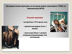 Диагноз СПИД - синдром приобретенного иммунодефицита ставят пациенту с ВИЧ-инфекцией при развитии у него СПИД-индикаторных заболеваний, утверж-денных классификацией ВОЗ (1994) (саркома Капоши, лимфомы, синдром истощения, ВИЧ-энцефалопатия и т.п.).