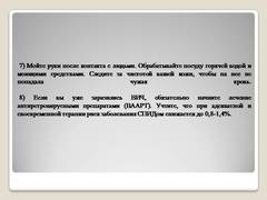 Слайд 15 7) Мойте руки после контакта с людьми. Обрабатывайте посуду горячей водой и моющими средствами. Следите за чистотой вашей кожи, чтобы на нее не попадала чужая кровь. 8) Если вы уже заразились ВИЧ, обязательно начните лечение антиретровирусными препаратами (ВААРТ). Учтите, что при адекватной и своевременной терапии риск заболевания СПИДом снижается до 0,8-1,4%.