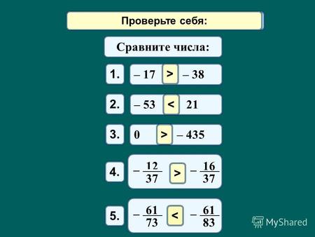 Математический диктант Сравните числа: – 17 – 38 1. – 53 21 2. 0 – 435 3. > Проверьте себя: 4. 12 37 – 16 37 – 5. 61 73 – 61 83 – > > < Проверьте.