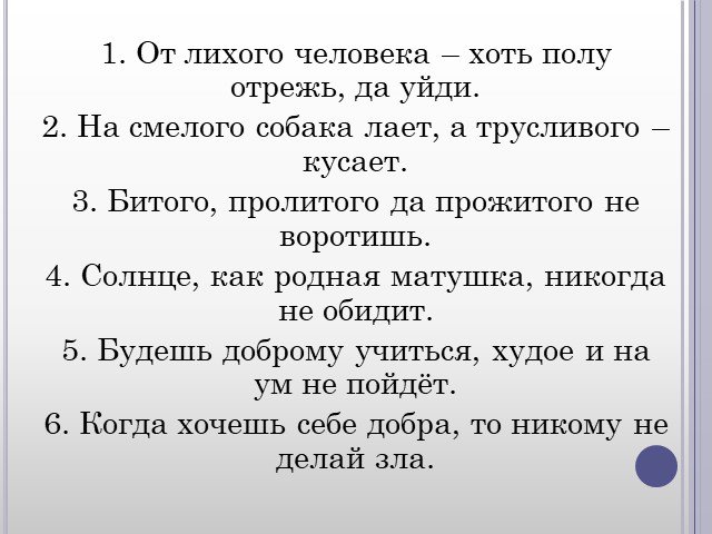 1. От лихого человека – хоть полу отрежь, да уйди. 2. На смелого собака лает, а трусливого – кусает. 3. Битого, пролитого да прожитого не воротишь. 4. Солнце, как родная матушка, никогда не обидит. 5. Будешь доброму учиться, худое и на ум не пойдёт. 6. Когда хочешь себе добра, то никому не делай зла.
