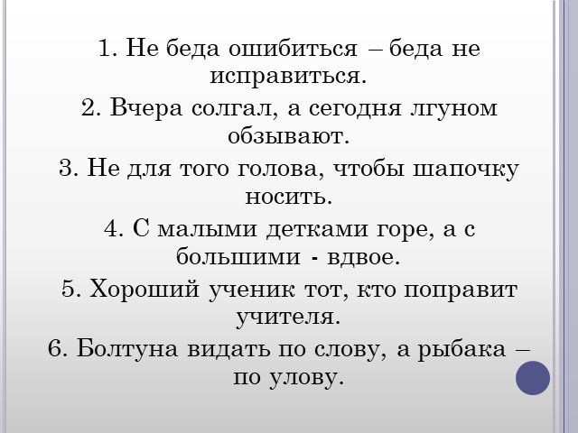 1. Не беда ошибиться – беда не исправиться. 2. Вчера солгал, а сегодня лгуном обзывают. 3. Не для того голова, чтобы шапочку носить. 4. С малыми детками горе, а с большими - вдвое. 5. Хороший ученик тот, кто поправит учителя. 6. Болтуна видать по слову, а рыбака – по улову.