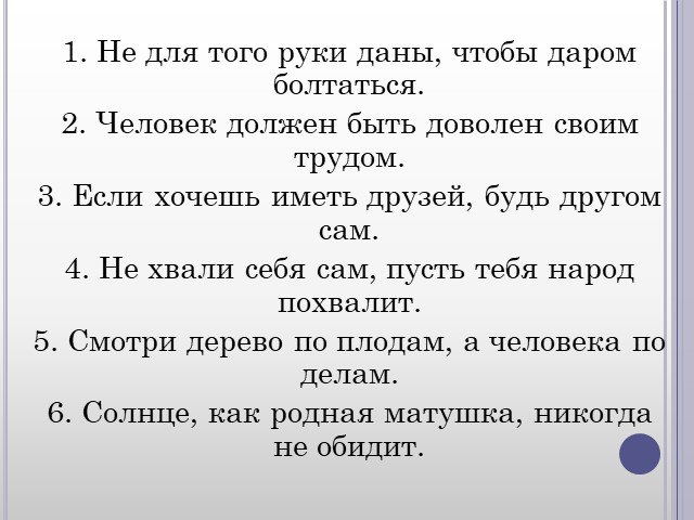1. Не для того руки даны, чтобы даром болтаться. 2. Человек должен быть доволен своим трудом. 3. Если хочешь иметь друзей, будь другом сам. 4. Не хвали себя сам, пусть тебя народ похвалит. 5. Смотри дерево по плодам, а человека по делам. 6. Солнце, как родная матушка, никогда не обидит.