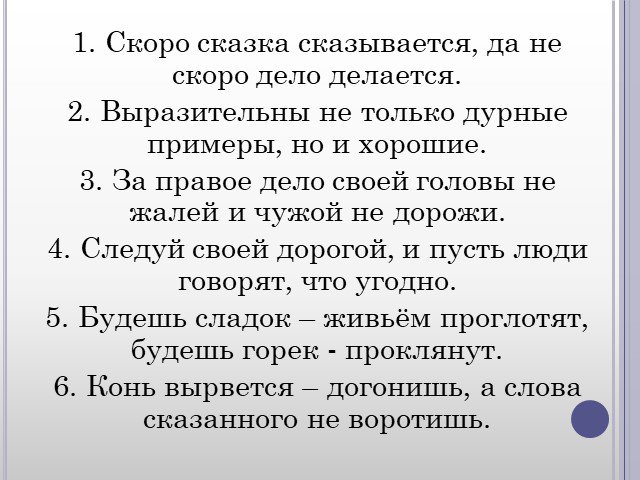 1. Скоро сказка сказывается, да не скоро дело делается. 2. Выразительны не только дурные примеры, но и хорошие. 3. За правое дело своей головы не жалей и чужой не дорожи. 4. Следуй своей дорогой, и пусть люди говорят, что угодно. 5. Будешь сладок – живьём проглотят, будешь горек - проклянут. 6. Конь вырвется – догонишь, а слова сказанного не воротишь.