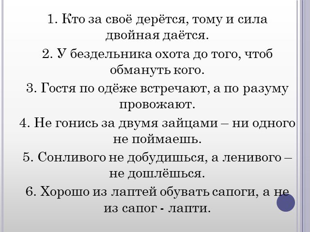 1. Кто за своё дерётся, тому и сила двойная даётся. 2. У бездельника охота до того, чтоб обмануть кого. 3. Гостя по одёже встречают, а по разуму провожают. 4. Не гонись за двумя зайцами – ни одного не поймаешь. 5. Сонливого не добудишься, а ленивого – не дошлёшься. 6. Хорошо из лаптей обувать сапоги, а не из сапог - лапти.