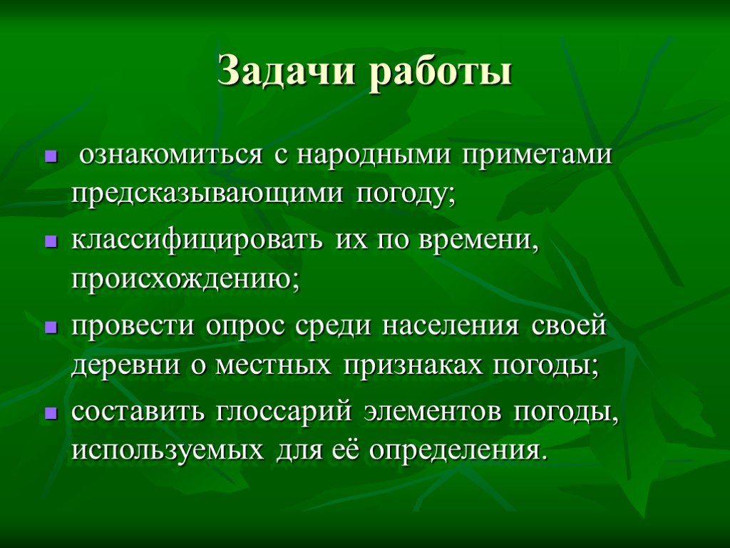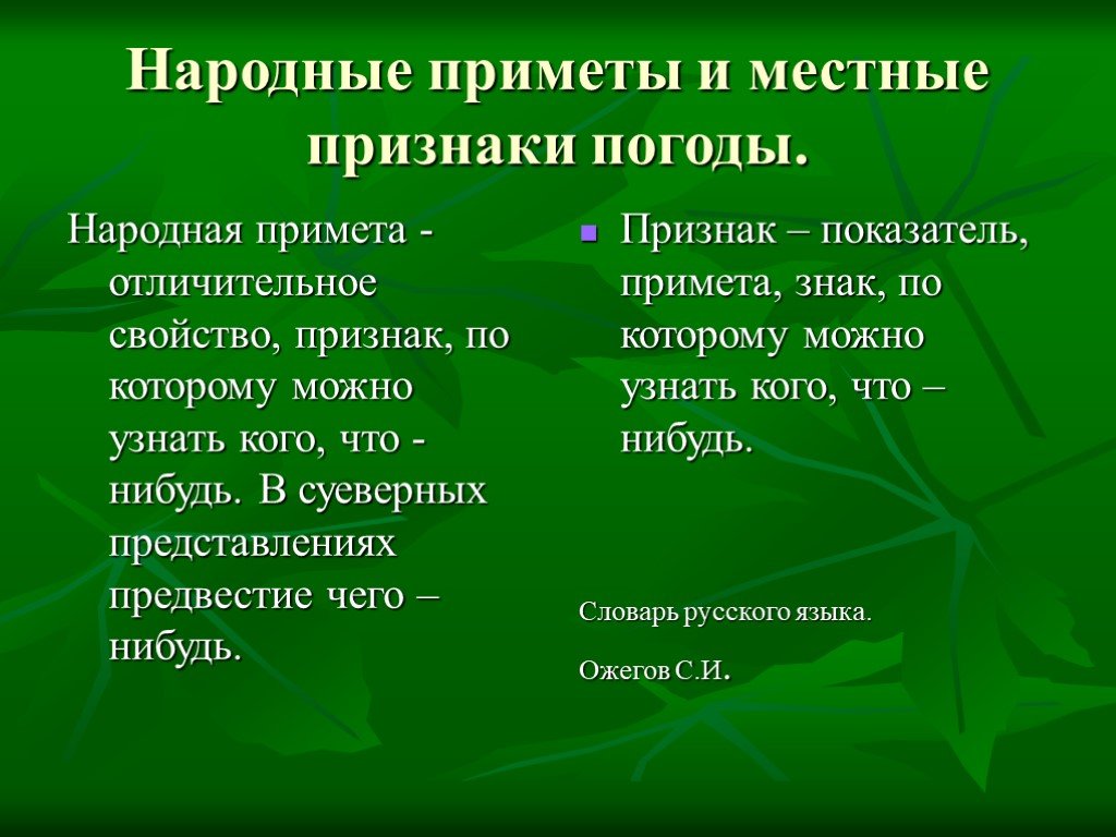 Метеорологи дают более точные данные о прогнозе погоды, но есть еще и народные приметы о погоде, которыми пользовались наши предки, и вы сейчас опираясь на свой жизненный опыт, скажите а вы знаете ли вы народные приметы о погоде? (ответы детей)