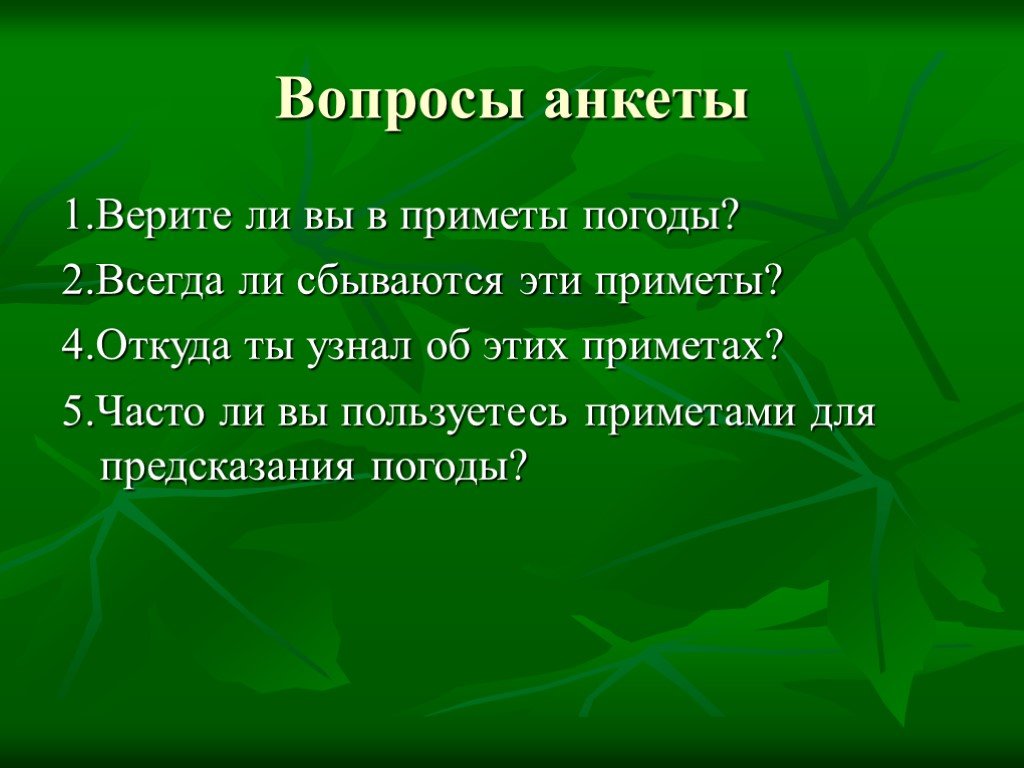 Ребята убедили меня в том, что погода, как и сам человек, являются частицами единого целого, прекрасного и совершенного - живой и неживой природы. Человек, как разумное существо на планете, может прогнозировать изменения погоды, проводить профилактическую работу по предупреждению заболеваний, а животных природа тоже научила предостерегать себя от ее грозных явлений.