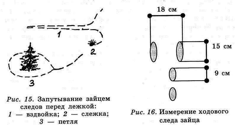 Итак, выпала свежая пороша. Охотник в угодьях, где скорее всего можно найти следы зайца (окрайки озимых полей, бывшие огороды, посадки фруктовых деревьев). Когда же след найден, начинается интереснейший для охотника процесс тропления. Заяц постоянно, а особенно направляясь на лежку, пускается на всевозможные уловки — лишь бы запутать след. То, дойдя до какого-то места, он поворачивает обратно по своему следу, чтобы потом громадным прыжком скинуться в сторону, да еще так, чтобы прыжок пришелся за куст, в кочки, густую заросль, словом, туда, где место приземления будет скрыто. То неоднократно выходит на езженую дорогу, идет по ней и потом скидывается, прячет следы там, где снег сдут ветром или покрыт настом.