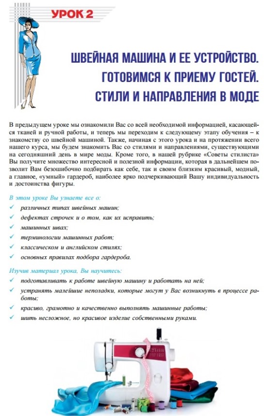 Собирая материал для этой статьи, я выписала несколько таких уроков и была весьма впечатлена содержанием. Вот содержание нескольких первых уроков из курса кройки и шитья: