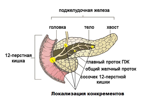 Калькулезный панкреатит характеризуется возникновением конкрементов, которые могут располагаться в различных местах протоков