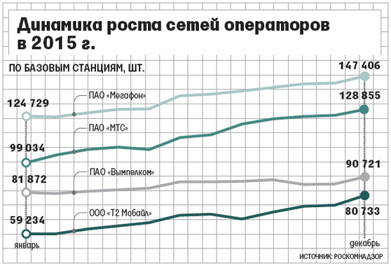Давайте взглянем на статистику от Роскомнадзора, который учитывает число базовых станций у всех российских операторов. Данные за 2015 год появились в конце марта 2016 года, это самые свежие цифры на момент публикации статьи.