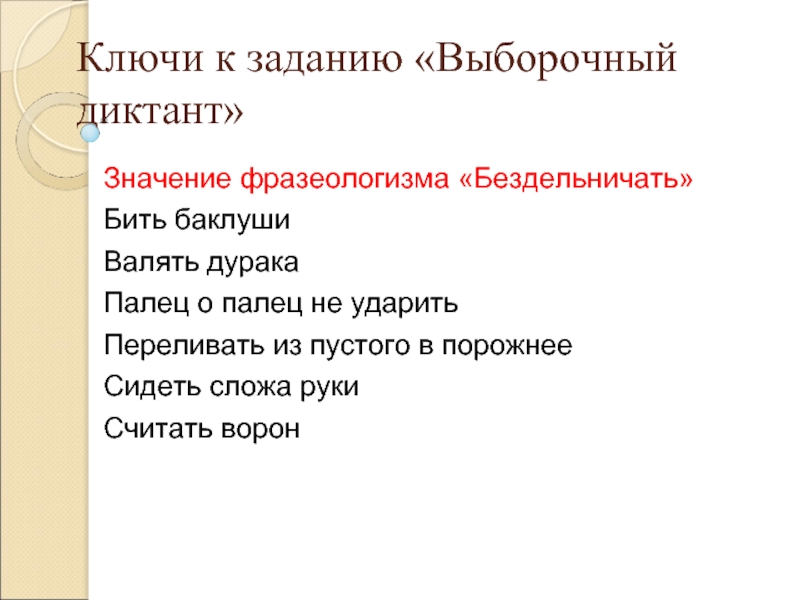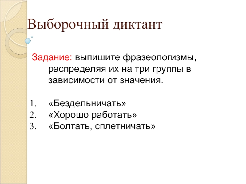 3. Творческий диктант: ученики записывают начало фразеологизма под диктовку учителя и самостоятельно продолжают фразеологизм: