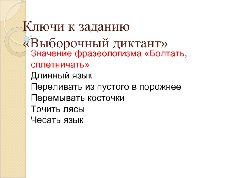 5. Творческий диктант: ученики записывают начало фразеологизма под диктовку учителя и самостоятельно продолжают фразеологизм: