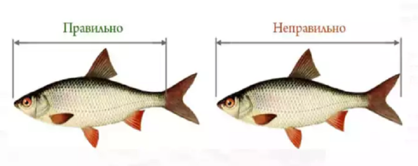 Промысловый размер рыбы определяется путём измерения длины рыбы от вершины рыла (при закрытом рте) до основания средних лучей хвостового плавника, а рака от середины глаза до конца основания хвостовой пластины. Закон запрещает добывать молодь. Поэтому каждый рыбак должен знать, как правильно измерить длину пойманного экземпляра, как показано на рисунке: