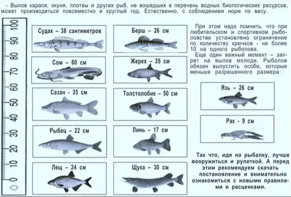 В случае, если после измерения длина пойманной рыбы или рака окажется меньше разрешённой, то в обязательном порядке пойманный экземпляр следует отпустить обратно в водоём, и нужно постараться как можно меньше нанести рыбе повреждений. Отправляясь на рыбалку, нужно внимательно изучить правила рыболовства конкретно для того региона, в котором собираетесь ловить рыбу. И помните:
