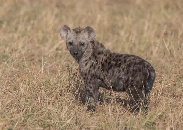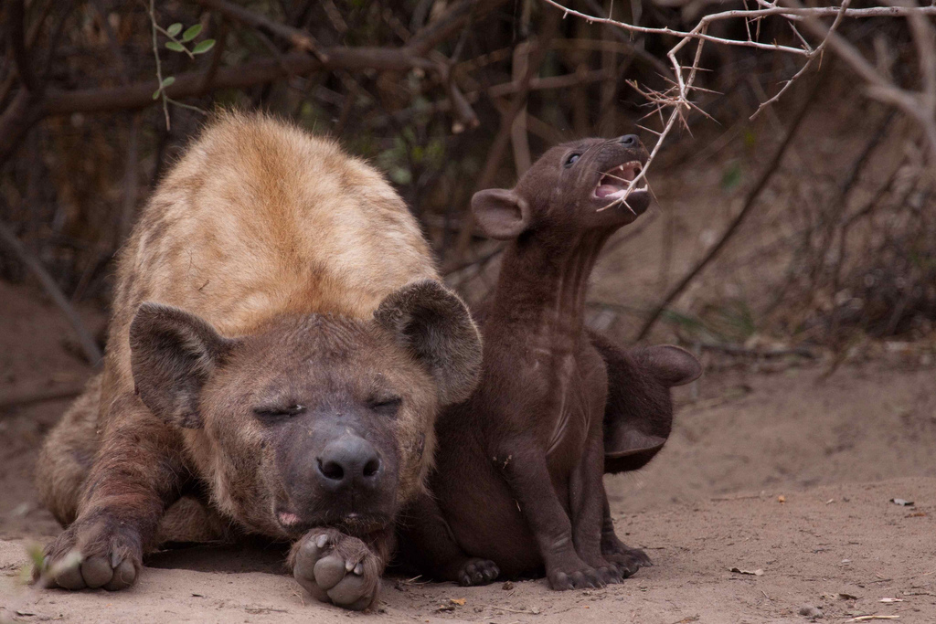 Детёныши гиены гораздо больше приспособлены к жизни, чем например у собак или кошек. Они рождаются полностью зрячими и весят до пары килограмм. Впрочем, это не мешает самкам, кормить детей своим молоком до 1,5 лет.