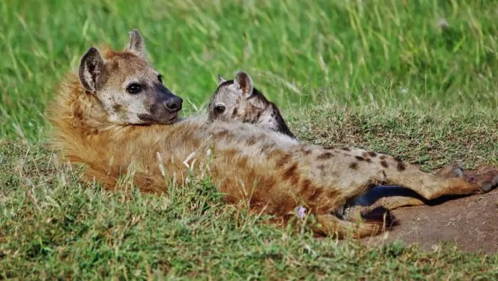 Пятнистые гиены не обладают половым диморфизмом. Они не только не отличаются по своим размерам и внешнему виду, но более того, у самок из-за высокого уровня тестостерона даже могут развиваться ложномужские органы.