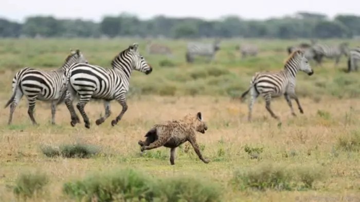 Несмотря на неуклюжий внешний вид — передние лапы у гиен заметно длиннее задних, они способны развивать большую скорость и сохранять её на довольно больших дистанциях.