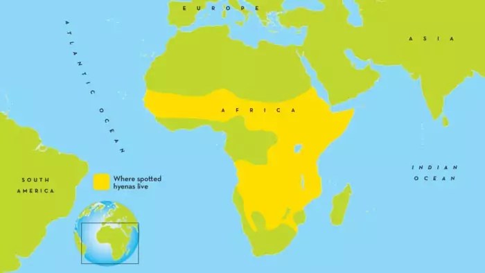 Пятнистая гиена распространена на большей части Африки к югу от Сахары, не считая южной оконечности континента. Селится этот зверь в самых разных местах, избегая лишь влажных тропических лесов и пустынь. Гиен можно встретить как в долинах на уровне моря, так и в горах на высоте до 4000 м, однако их излюбленным обиталищем являются бескрайние травянистые саванны, где водится великое множество травоядных копытных. Гиены легко приспосабливаются к любым условиям жизни и в поисках отбросов наведываются даже на окраины городов.