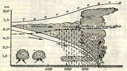 В облаках большую опасность представляют восходящие потоки силой до 30м/с и более и нисходящие до 15 м/с и более. Кроме того, в облаках могут быть грозы, сильные ливневые осадки, а в зоне отрицательных температур – интенсивное обледенение. Но ширина этой опасной зоны небольшая, примерно 50 км.