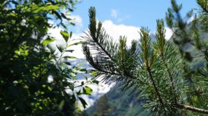 На фоне этих вершин удивительно чистое голубое небо кажется бездонным, солнечные лучи, отражаясь в зеркале ледников, переливаются всеми цветами радуги, а легкий ветерок доносит неповторимый аромат чистейшего горного воздуха, пропитанного запахом хвои, к которому во время цветения альпийских лугов примешивается еще букет из рододендрона, лютика, колокольчика, незабудки и чабреца. Эта сказочная панорама гор видна и с балконов корпуса, расположенного на краю поляны, поросшей причудливыми многолетними пихтами, и из окон рубленых деревянных домиков, расставленных по ее периметру.
