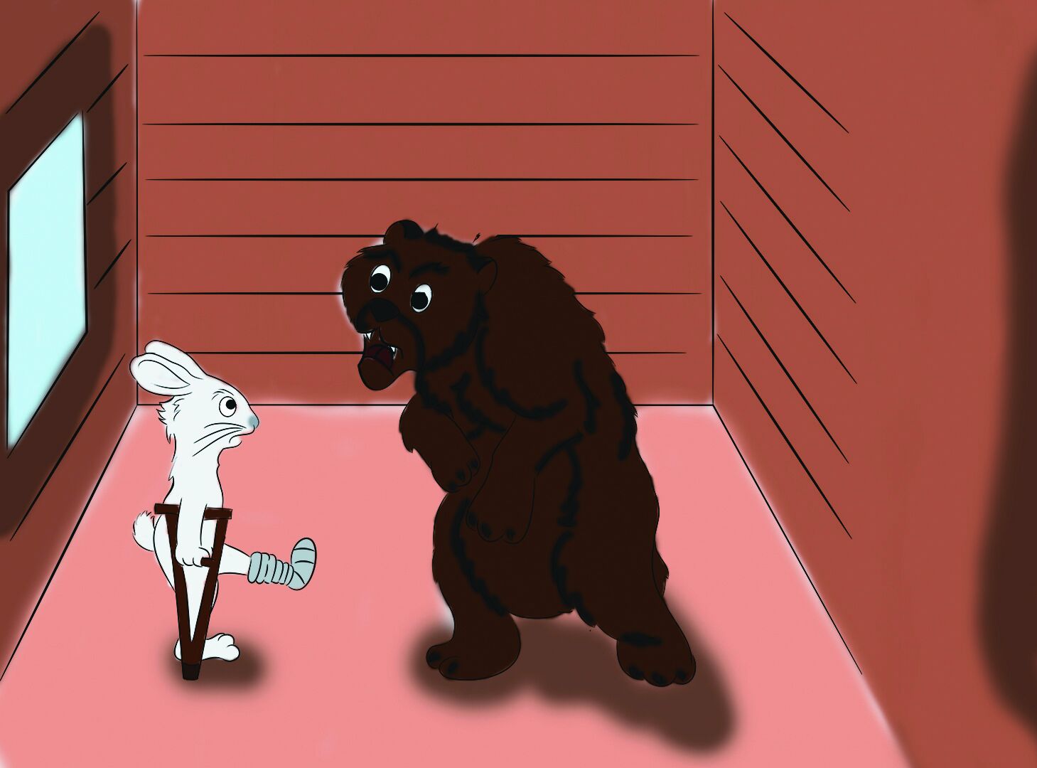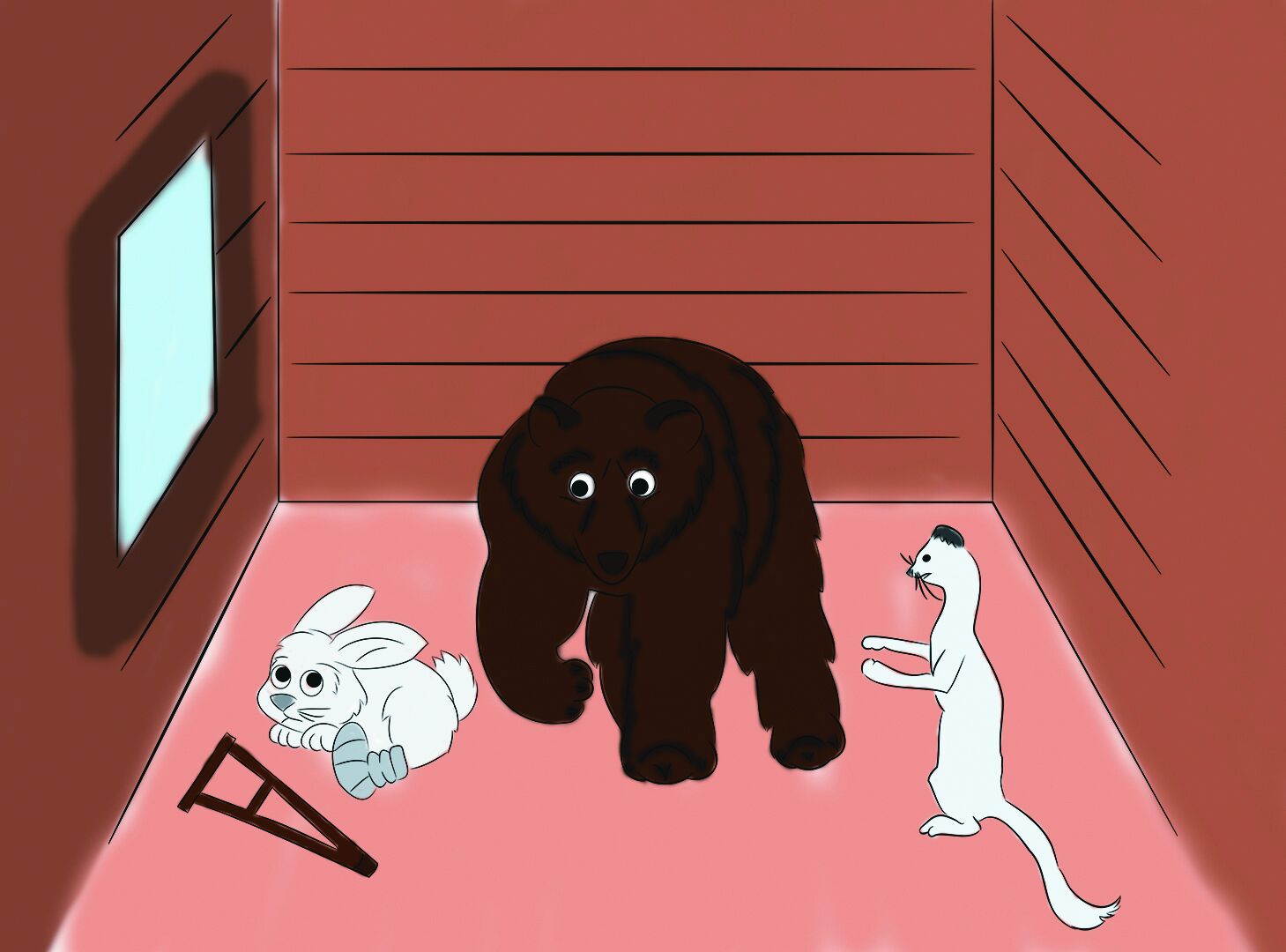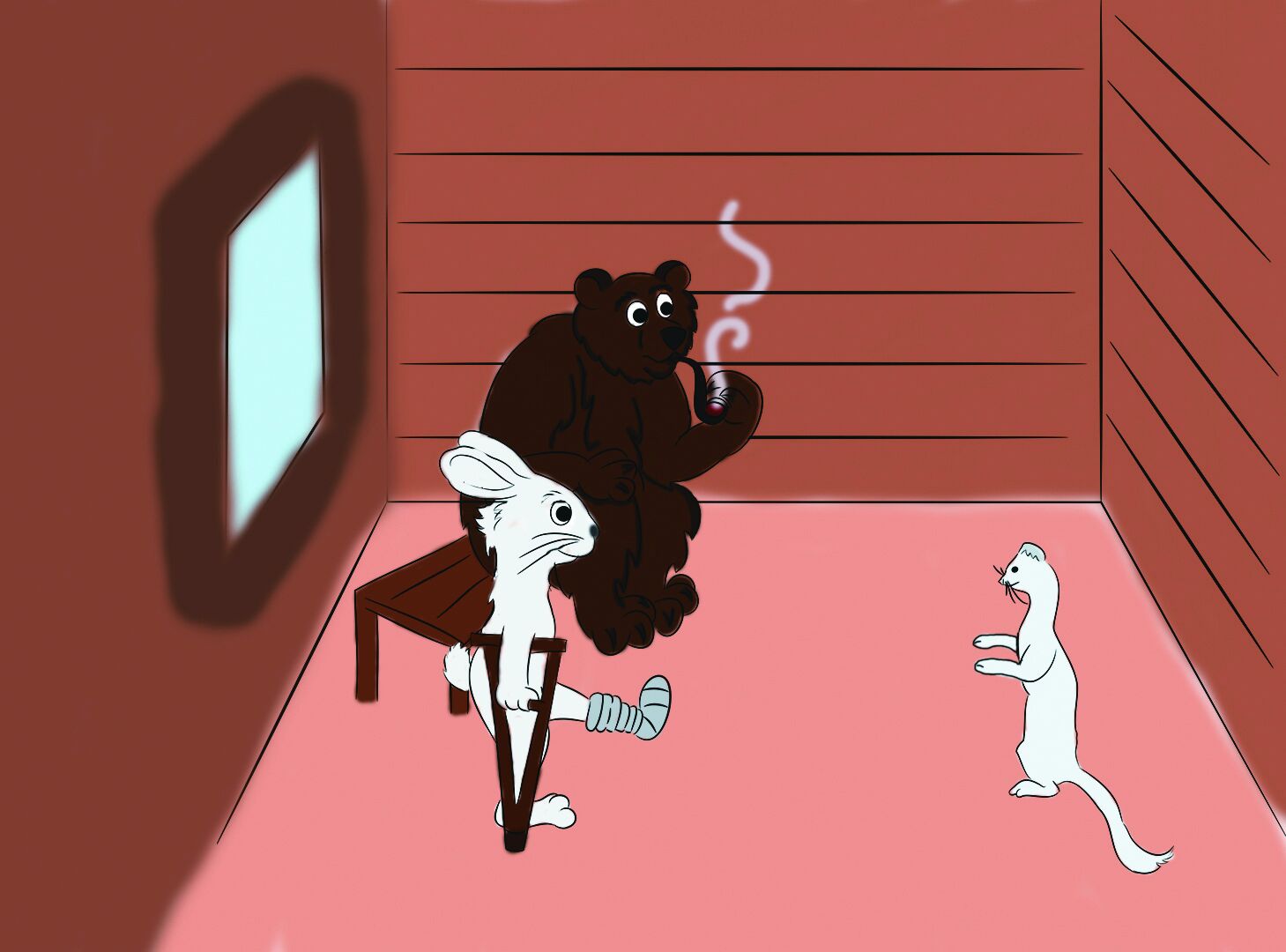 Поднял глаза горностай - сидит медведь на почётном месте, курит степенно трубку. А по правую сторону от хозяина - заяц. Лапу хромую вперёд выставил, на костыль деревянный опирается.