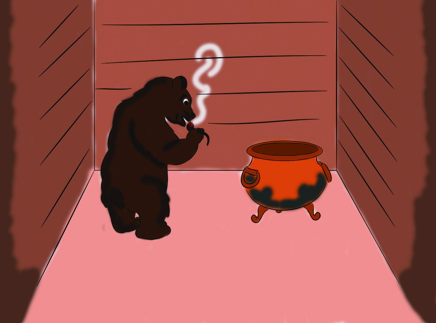 - Тихо! Думать буду, - сказал медведь и задумался. Долго он смотрел на свой золотой котёл с бронзовыми ушками. Никогда тот котёл не чистили от жира, чтобы удачу не спугнуть.