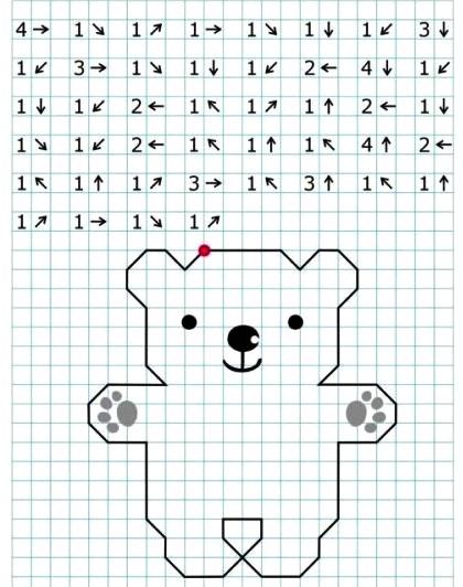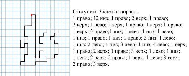 «Теперь поставь карандаш на самую нижнюю точку. Внимание! Три клетки вправо. Одна клетка вверх. Одна клетка влево. Две клетки вверх. Три клетки вправо. Две клетки вниз. Одна клетка влево. Одна клетка вниз. Три клетки вправо. Одна клетка вверх. Одна клетка влево. Две клетки вверх. Теперь продолжай рисовать узор сам».