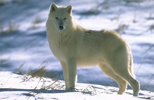 Тундровый волк - Размещение волков по тундре определяет размещение оленей. Масса тела в среднем 42-49 кг. Для этих волков характерен очень длинный, густой и мягкий волосяной покров светлой окраски. Иногда встречаются чисто белые экземпляры, но чаще окраска бывает тёмная, варьирующая от серовато-белой до серой, у некоторых на спине даже с черноватыми оттенками. Кормом волку служат копытные, заяц-беляк, грызуны. Зубы отличаются массивностью и с одинаковым успехом рвут и размалывают пищу. Это позволяет тундровому волку раздирать на части самых крупных млекопитающих и дробить даже наиболее крепкие кости. Волк и волчица сходятся только в сезон спариваний (апрель-май), но находят друг друга раз за разом.