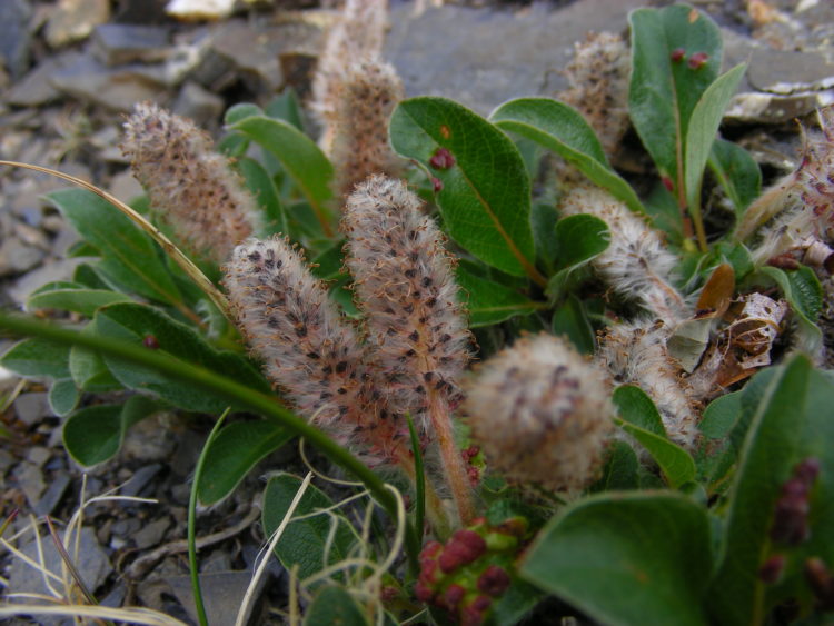 Человека, впервые попавшего в тундру, особенно удивляют карликовые ивы . Некоторые из них чрезвычайно малы, имеют ползучие побеги, распростертые среди мохового ковра, и очень напоминают какие-то мелкие травянистые растения. Лишь приглядевшись, замечаешь у таких «трав» настоящие ивовые сережки, правда очень мелкие и короткие. Листья карликовых ив тоже необычно мелкие, для нас непривычные.