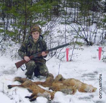 Успел только-только. До кустов было около ста шагов, и с этой точки звери не просматривались, но едва я встал за одинокую ёлочку на краю леса, как показались все три красавицы. Впереди бежала мелкая сучонка, а за ней шагах в двадцати - оба кобеля, заметно крупнее её. При встречном выстреле очень важно выбрать момент, когда зверь или птица, увидев охотника, либо после первого промаха, уже не имеет возможности развернуться и уйти назад или проскочить за спину охотнику. В моей ситуации при выстреле по головной лисе один или оба кобеля имели шанс уйти назад, в загон, поэтому я решил начать с них.