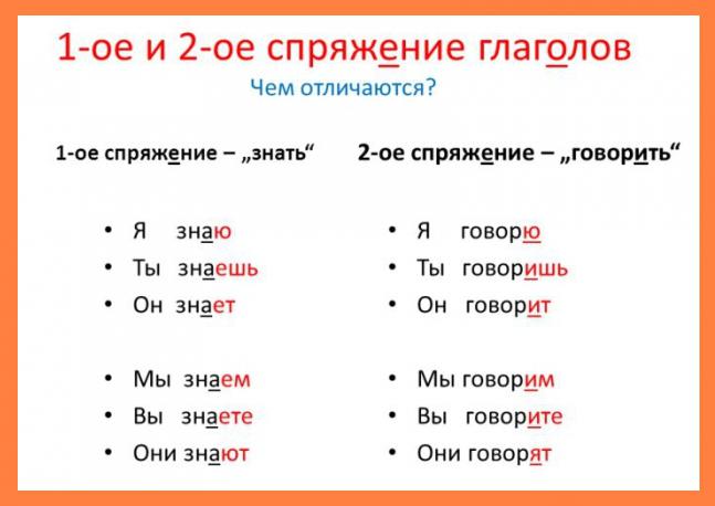 Чтобы легко выучить, запомнить и пользоваться правилом спряжений, для начала нужно понять основной принцип — существует два общих спряжения, потому что существует два типа окончаний у глаголов (если не говорить об исключениях).