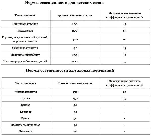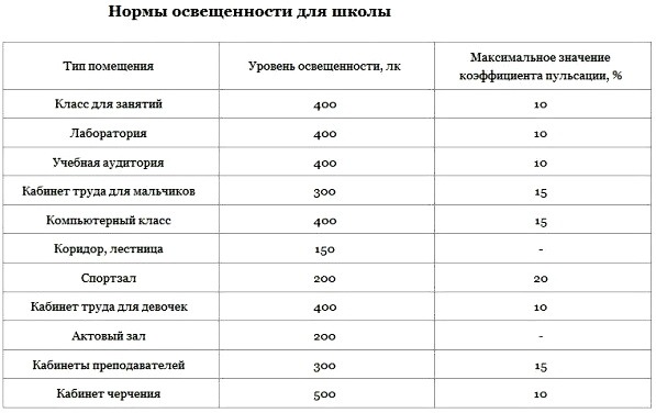 Нормативы освещенности для различных типов помещений