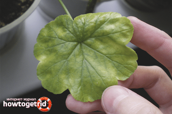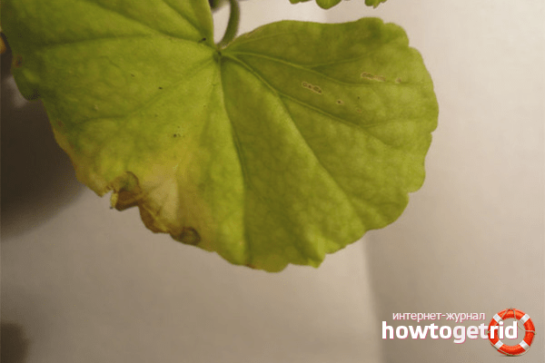 Признаки. У листочков герани появляется сухая желтая кайма темного, почти коричневого оттенка. Пигментация заметна на всем растении.