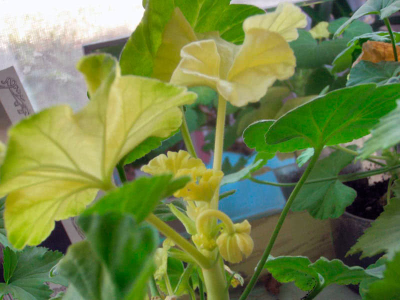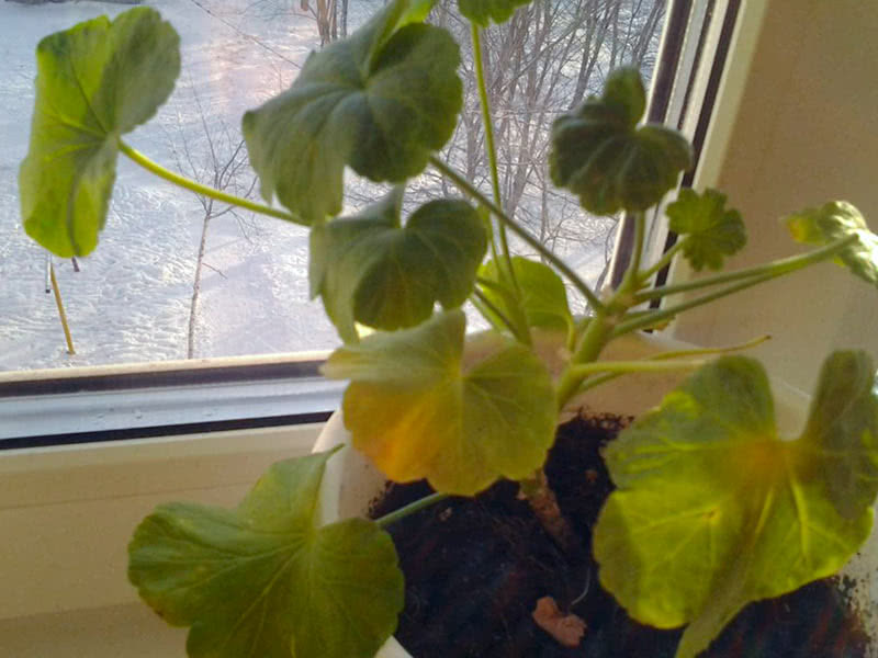 Признаки. Постепенно желтеют и засыхают нижние листочки, стебель вытягивается, герань очень редко и мало цветет.