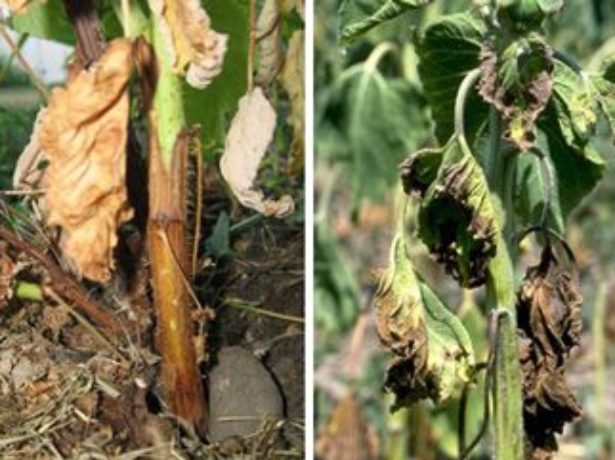 | В нижней части растения листва желтеет, а затем чернеет и вянет. | Несвоевременно удалённые растительные остатки, некачественный грунт, чрезмерное пересушивание грунта. | Вертициллезное увядание | |