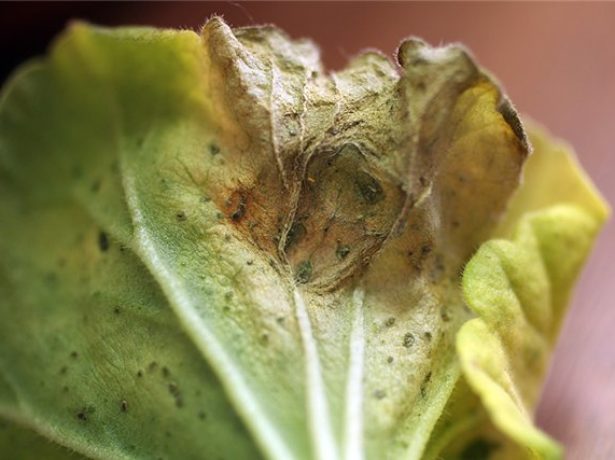 При поражении ботритисом листья герани сохнут и покрываются покрытыми пушком пятнами радиальной или V-образной формы. Больные участки следует удалить, а герань обработать раствором фунгицида. В дальнейшем нужно отрегулировать полив растения.