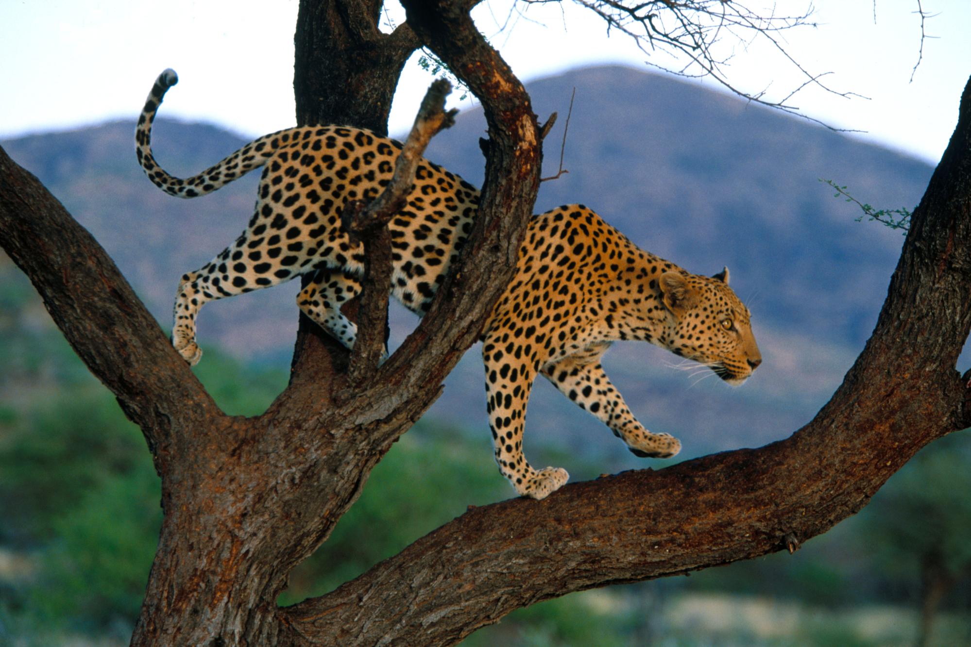 На деревьях леопарды преследуют обезьян ловко прыгая с ветки на ветку.
